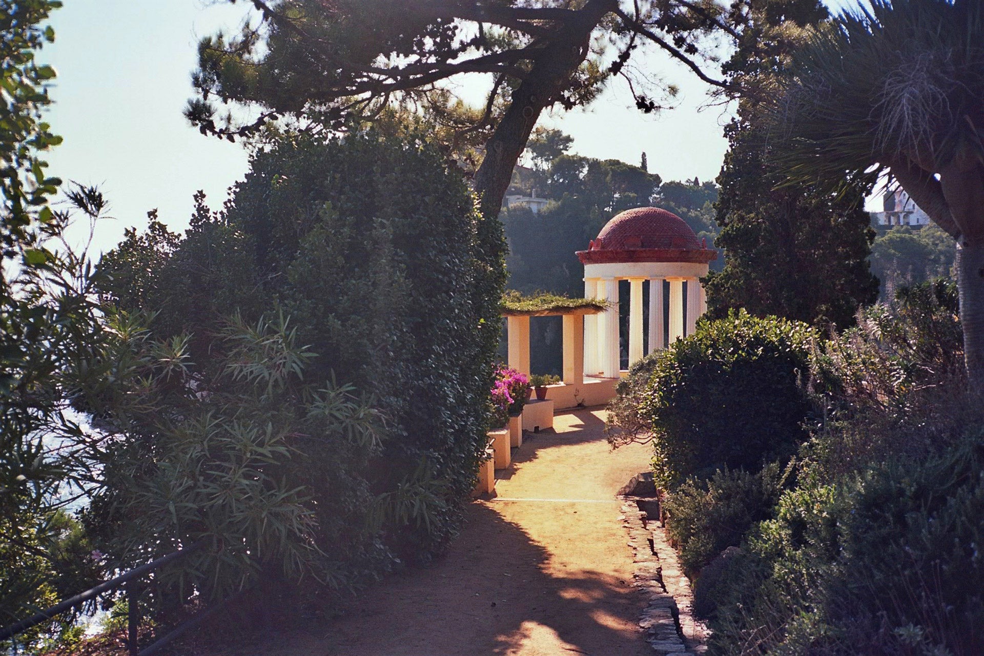 This garden and its surrounding park are perched on a rocky cliff from which the close proximity of the sea comes us as a stunning surprise. At the entrance, a white building with green window blinds and a typical clay roof marks a strikingly beautiful contrast to the spectrum of colorful flowers and plants that wind around it like a glorious carpet.