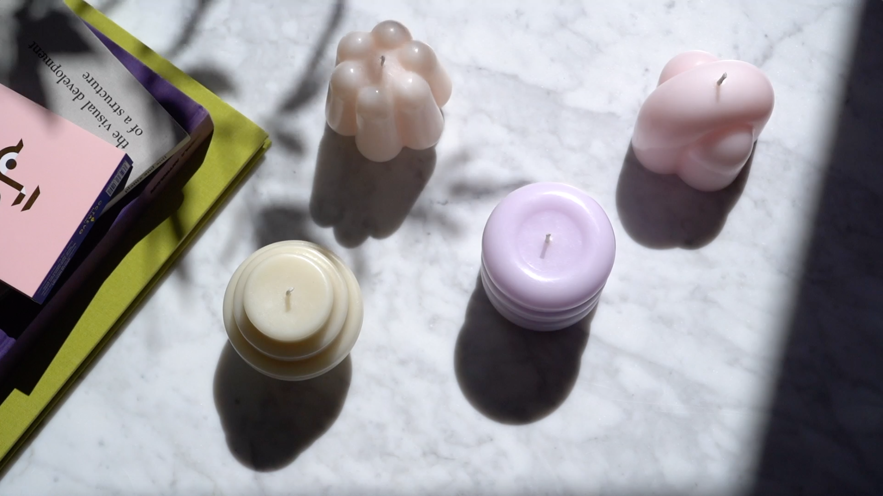 The Templo Candle by OCTAEVO features five pastel hand-poured abstract wax shapes, forming a vibrant artisan centerpiece.